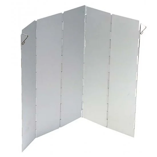 Ein vollständig zusammenklappbarer universeller Kochwindschutz. Dieser Kochwindschutz kann in Kombination mit einem Campingkocher oder einem Gasbrenner verwendet werden. Dieser 5-teilige Kochwindschutz wird um die Brenner oder um den Brenner gelegt. Dadurch wird ein Ausblasen der Flamme verhindert und die Hitze der Flamme wird besser auf die Pfanne übertragen. Nach Gebrauch lässt sich der Windschutz einfach und kompakt verstauen.