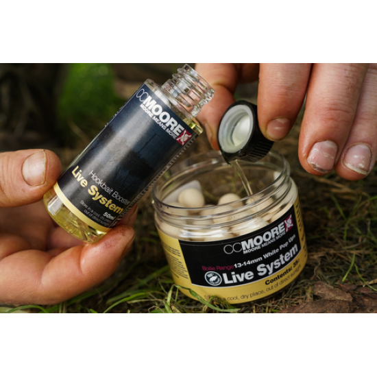 Geben Sie Ihren Live System Pop Ups/Hookbaits eine leichte Schicht des kraftvollen passenden Hookbait Boosters, lassen Sie ihn trocknen und wiederholen Sie ihn bei Bedarf. Wiederholte FlĂŒssigkeitsbeschichtung von Pop-Ups kann deren Auftrieb verringern.