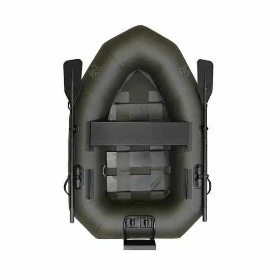Kleinste en meest lichtgewicht boot in de nieuwe range 0,7mm dik materiaal verkrijgbaar in het unieke Fox Camo of Groen Twee luchtkamers Veilig overdrukventiel Verbeterde boeghoek voor soepeler navigeren in golven Extra brede en langere binnenmaat voor meer comfort Versterkte onderkant voor extra bescherming Strategisch geplaatste handgrepen voor betere balans tijdens dragen Unieke verschuifbare zitting voor positionering naar eigen voorkeur Zwarte aluminium peddels en lichtgewicht zwarte aluminium zitting Afneembare, zwarte bracket voor elektromotor/dieptemeter Ingebouwde zwarte multiplex vloer (voor snel gebruiksklaar maken) Trek- en ankerpunt van zwart PVC Versterkte zijkanten voor maximale becherming van boot Geleverd met voetpomp, reparatiekit en ventielsleutel.