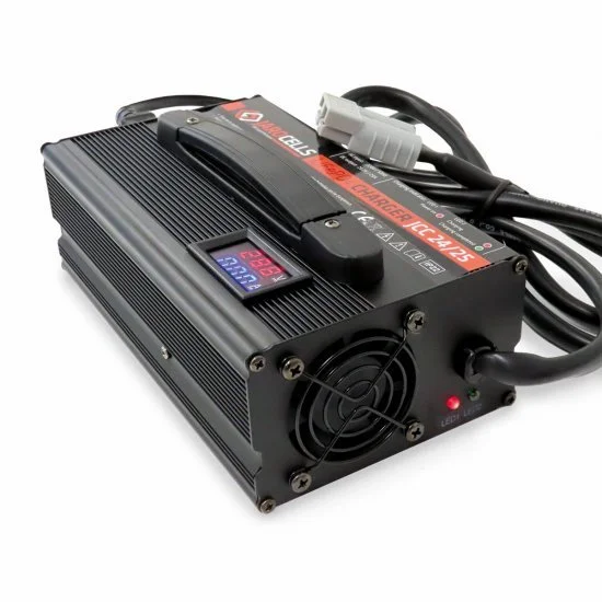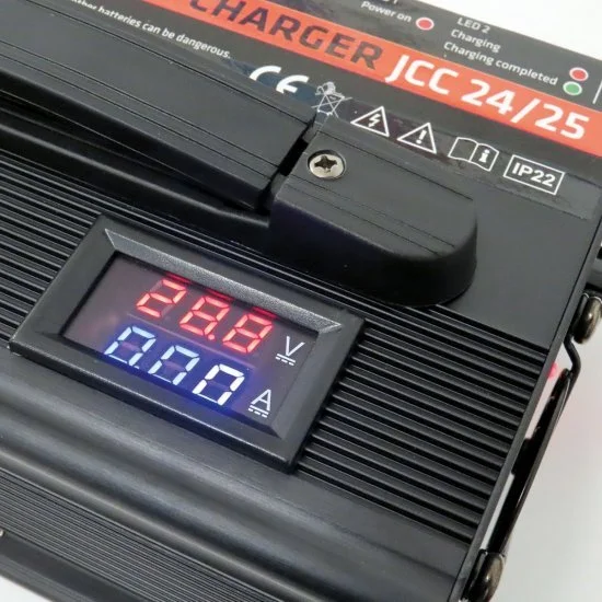 Jarocells 24V25A Ladegerät IP22 mit Ampere- und Voltmeter. Dieses Ladegerät ist mit einem grauen Anderson-Stecker ausgestattet.