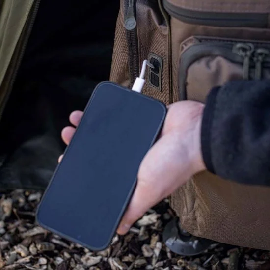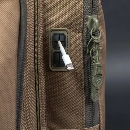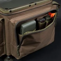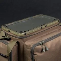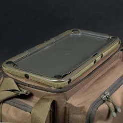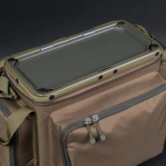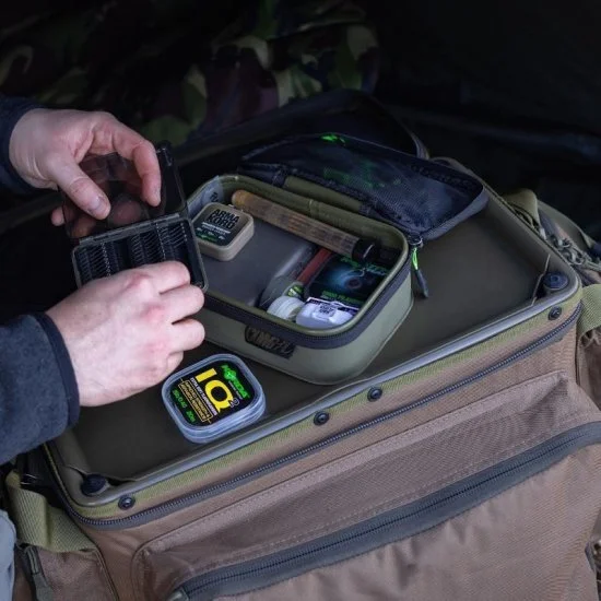 Auf der Außenseite hat die Carryall fünf Taschen, von denen vier perfekt auf die EVA-Taschen Compac 100, 110, 125 und 140 abgestimmt sind. Die Fronttasche ist groß genug für eine Korda Tackle Box, wodurch der Platz im Hauptfach optimal genutzt wird. Die Vordertasche verfügt über zwei interne Organizer, die an Ihre individuellen Bedürfnisse angepasst werden können, wobei die Endtaschen mit konturierten Öffnungen für einfachen Zugriff auf Ladekabel ausgestattet sind.