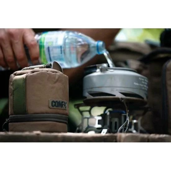 Die Korda Compac Gas Canister Jacket isoliert Gaskartuschen der Größe 500 vor Witterungseinflüssen und verstärkt so die Wirkung des Gasbrenners. Taschen für Löffel und Feuerzeug halten sie griffbereit.