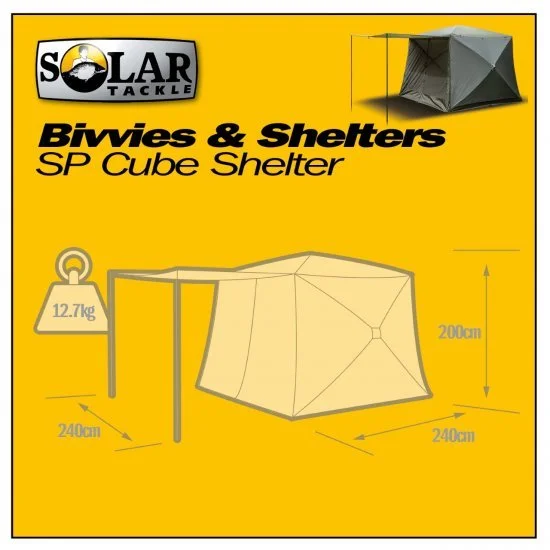 De SP Cube Shelter is de ultieme quick up shelter, en de eerste in z’n soort in de hengelsport. Het vier Push-Loc ontwerp zorgt ervoor dat het opzetten slechts 30 seconden duurt. Een simpele kwestie van de shelter ontvouwen en de vier hubs(in plafond en de zijkanten) naar buiten duwen. Met een afmeting van 2.0 mtr hoog en 2.4mtr x 2.40 mtr oppervlakte biedt de Cube voldoende ruimte om er zelfs rechtop in te staan. Bij Team Outdoors is de Cube rondom voorzien van Solar’s top spec mozzi mesh, plus oprolbare panelen voor wanneer het regent. De deuren zijn voorzien van Solar’s unieke Mag-Loc sluitende deur en kan tevens als luifel worden gebruikt d.m.v. de meegeleverde palen. Al met al de ideale kooktent/social tent, maar kan natuurlijk ook gebruikt worden als bivvy.