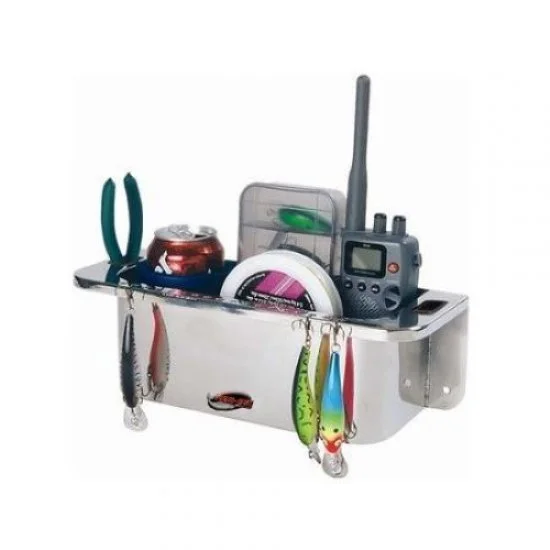 Polierte Edelstahlbox zur Aufbewahrung von Handy, Papieren, Getränken etc.! Darüber hinaus befinden sich vorne mehrere kleine Öffnungen zum Aufhängen von Ködern und seitliche Öffnungen zum Aufhängen von diversen Werkzeugen.