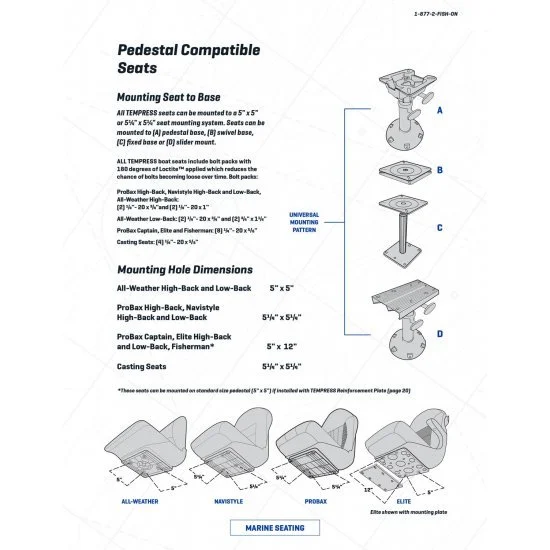 - Einfache Installation; akzeptiert jedes 5 ¼“ x 5 ¼“ Bootssitz-Montagesystem oder Sockel