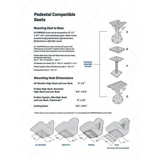 - Einfache Installation; akzeptiert jedes 5 ¼“ x 5 ¼“ Bootssitz-Montagesystem oder Sockel